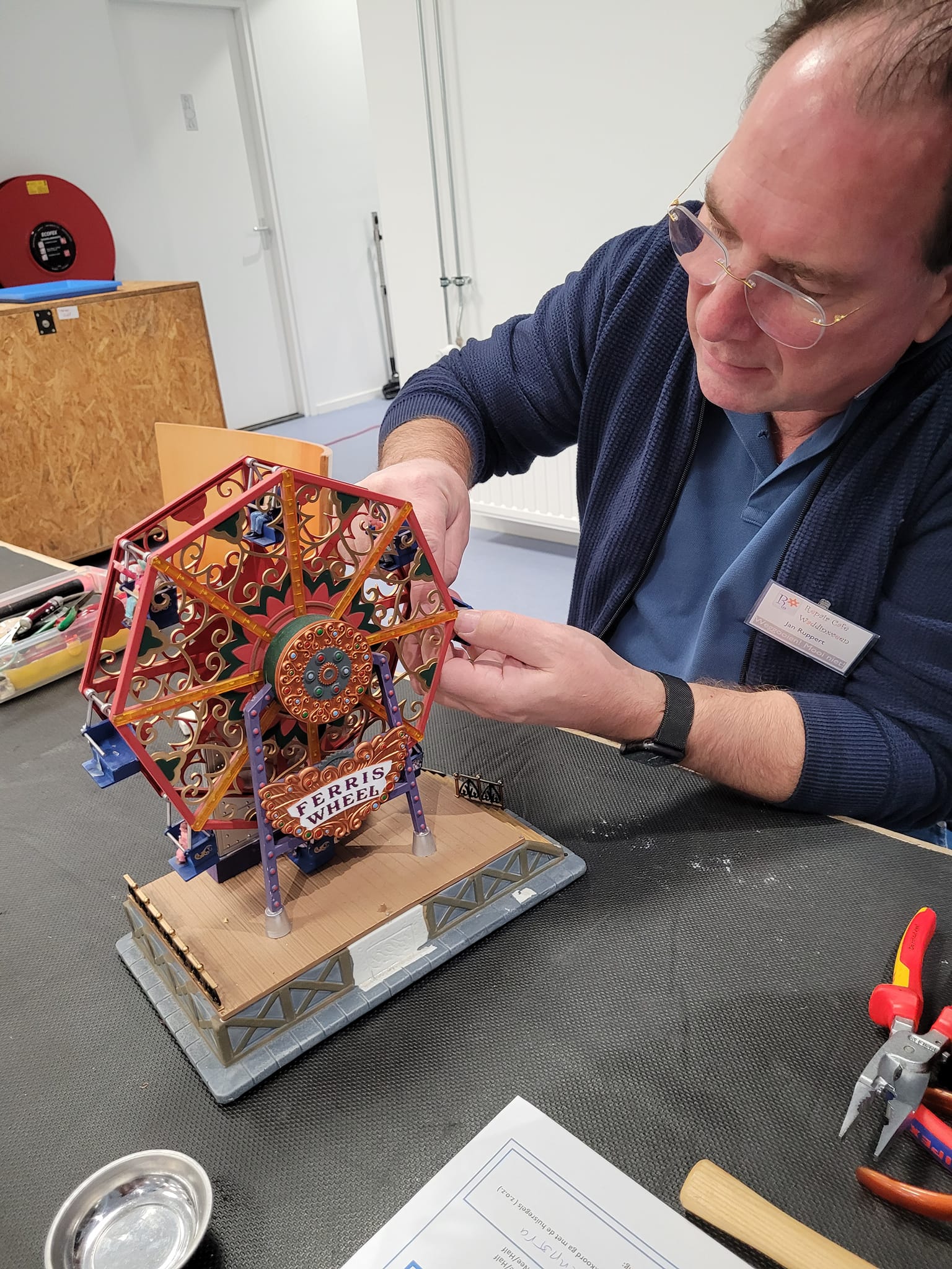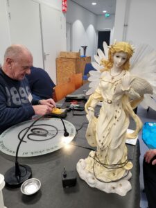 Wat een drukte weer bij Repair Café Waddinxveen waar steeds meer mensen ons weten te vinden. Naast de gebruikelijke stofzuigers, koffiezetapparaten, lampen, fietsen, klokken, naaiwerk en audio deze keer leuke variatie voor de klusmannen: een lichtgevend Mariabeeld en een draaimolen.